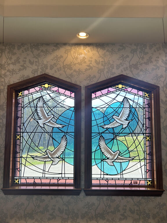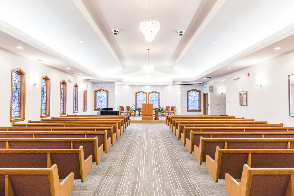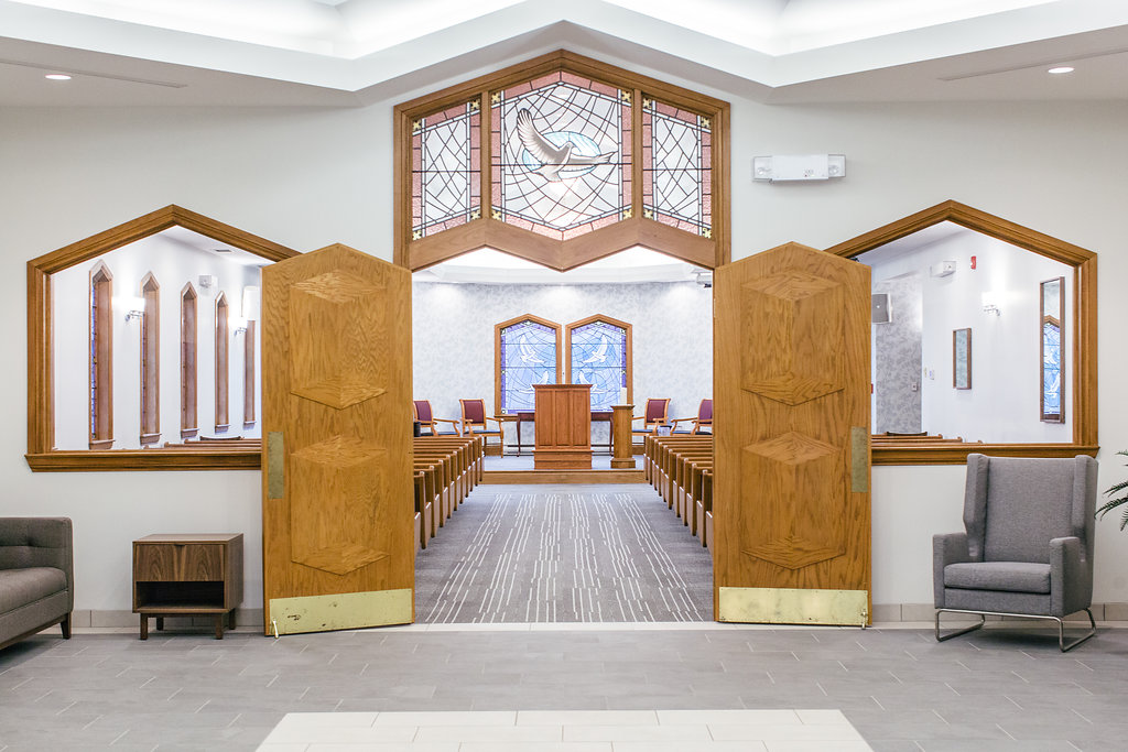 The beautiful Chapel features a seating capacity of over 200, with a special private alcove. The stained glass windows above the altar with the Dove of Peace and the Circle of Life windows showcasing the opening and closing of a flower as you walk up the aisle are peaceful and comforting.